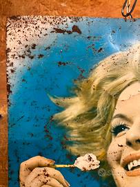 Realizzata in metallo smaltato/litografato, presenta una grafica vivace dai toni intensi: l’azzurro brillante dello sfondo esalta il biondo luminoso dei capelli mossi dal vento, mentre il logo “Gelati Motta” in blu profondo domina la parte inferiore con caratteri morbidi e avvolgenti tipici dell’epoca. Un’immagine elegante e seducente, capace ancora oggi di catturare lo sguardo e raccontare un’epoca.