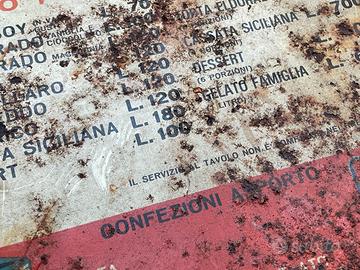 Vendo insegna vintage della Eldorado, presente in vecchia drogheria di famiglia negli anni 80. Dimensioni: 81x33 cm. Presenti gli storici prodotti iconici dell'epoca come il "Camillino", il "Calippo" e la "Cassata Siciliana", con i relativi prezzi in Lire. Il personaggio in alto è il celebre cowboy, uno dei primi simboli del marchio. In quegli anni, Eldorado scelse questo immaginario esotico per attirare i bambini, distinguendosi da Algida che mirava a un pubblico più adulto. L'insegna purtroppo presenta segni di ruggine e usura, tipici di oggetti esposti all'aperto per lungo tempo. Scambio a mano a Milano e Provincia, posso valutare la spedizione.