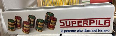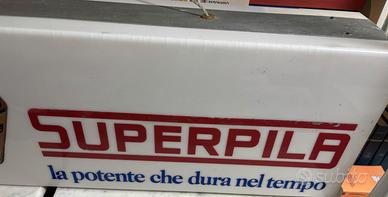 Vecchia insegna pubblicitaria luminosa della Superpila. L'insegna è funzionante e si presenta in buone condizioni. Impianto elettrico originale.