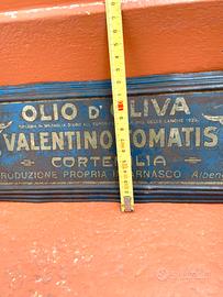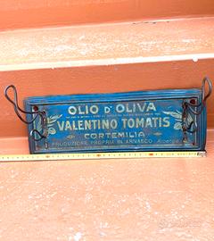 Insegna Pubblicitaria Rarissima 1925 Con 2 Attaccapanni In Latta Originale. In latta serigrafata , attacca panni girabili in ferro , OLIO D’OLIVA VALENTINO TOMATIS ARNASCO ALBENGA CM 34x12,5 in buonissime condizioni