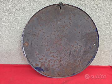 L' insegna misura 50 cm di diametro ed ha qualche piccolo difetto della smaltatura lungo il bordo.