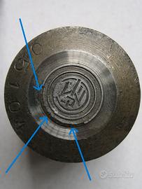 Inter. Coppia di conii originali Lorioli positivo e negativo (maschio e femmina) in acciaio per distintivo. Presentano inciso sul bordo il numero di serie 05104. Dimensioni del distintivo: diametro mm 14,70 circa. Dimensioni del conio positivo o maschio: diametro mm 34 circa; altezza mm 35 circa; peso g 227 circa. Dimensioni del conio negativo o femmina: diametro mm 60 circa; altezza mm 40 circa; peso g 782 circa. Come da foto, presentano entrambi sul bordo velature di ruggine, il conio positivo presenta delle mancanze nell’impronta (manca parte del cerchio esterno) così come evidenziato in foto, presenti ulteriori minimi segni d’uso.