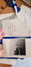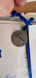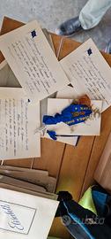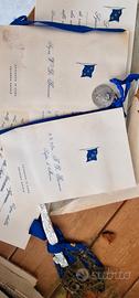 Invito Nave Andrea Doria. Invito ufficiale con medaglia originale in argento e fiori del 1952. Con nastro commemorativo o celebrativo proveniente dalla Nave Andrea Doria della Marina Militare Italiana, accompagnato da un invito formale cartaceo. Il nastro blu riporta la scritta ricamata in oro "NAVE ANDREA DORIA". Si tratta di un cimelio storico, probabilmente legato a un evento ufficiale o a una cerimonia tenutasi a bordo della nave (Messa più colazione) per l'ex prefetto di Messina e famiglia, Filippo di Giovanni. L'invito allegato cita l'"Ammiraglio Comandante in Capo della Squadra Navale" e sembra riferirsi a un evento svoltosi il 10 febbraio. È un oggetto da collezione che rappresenta un pezzo di storia navale italiana.