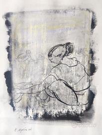 Opera originale su carta raffigurante una figura femminile seduta, risolta con un segno essenziale e delicato. La composizione è costruita su velature e campiture morbide nei toni del grigio con leggere accensioni più chiare, che creano profondità e atmosfera. Il tratto grafico definisce la figura con eleganza, lasciando ampio spazio al “non detto” e valorizzando il carattere intimo e contemplativo della scena. Completa di autentica su cartellino al retro.