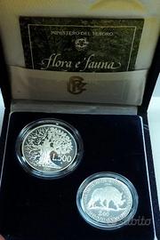 DITTICO 2 MONETE ARGENTO TITOLO 835 DA 500 E 200 LIRE ITALIA 1991 "FLORA E FAUNA". PESO TOTALE 24 GR. CONDIZIONI PROOF FONDO A SPECCHIO IN COFANETTO UFFICIALE DA ZECCA.