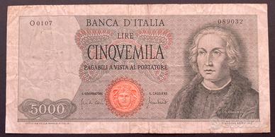 Italia 🇮🇹 banconota 5000 lire Cristoforo Colombo I primo tipo una sola caravella 20.01.1970