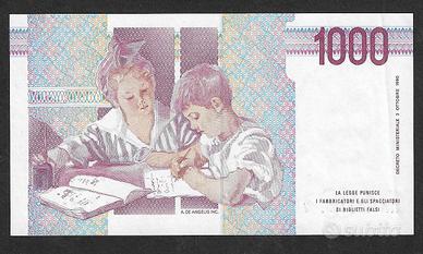 Nazione:Italia Serie:1946~2001 Repubblica Italiana Num. catalogo:World Paper MoneyP-114a.1 Unificato UNI 533 Emesso il:1990-10-03 Distribuzione:Circolazione Standard Dimensione:110 x 60 mm Composizione:Carta Tipografia:Italia, Officina della Banca d'Italia, Roma - ODBI Valore facciale:1.000 lire Coniatura:360.000.000 Descrizione:Firme: Carlo Azeglio Ciampi (Governatore) & Fortunato Speziali (Cassiere) -Seconda lettera della serie #:A(indica l'emissione24.10.1990) -Seriale: AA-000.001-A to VA-999.999-Y (w/o I, J, O, Q, X, Z)