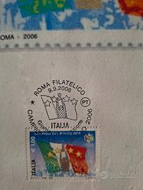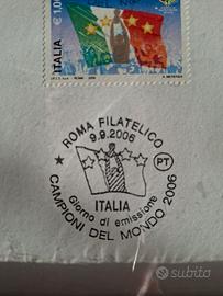 Per gli appassionati di calcio e collezionisti di memorabilia sportiva, propongo un esclusivo quadro commemorativo dedicato alla vittoria della Nazionale Italiana ai Mondiali di Germania 2006. L'opera è composta da una stampa artistica di grande formato che riproduce il design del francobollo celebrativo, accompagnata da un esemplare originale del francobollo da 1,00 Euro emesso da Poste Italiane. L'elemento di massimo rilievo collezionistico è la presenza del doppio annullo speciale "Roma Filatelico", datato 9 settembre 2006. Il timbro reca esplicitamente la dicitura "Giorno di emissione", certificando che l'oggetto è stato prodotto e annullato proprio nel primo giorno ufficiale di uscita del francobollo dedicato ai Campioni del Mondo. Il design dell'annullo riprende iconograficamente la coppa alzata al cielo e le quattro stelle, simbolo dei titoli mondiali conquistati. Il tutto è presentato in una cornice in legno che ne esalta il valore espositivo, protetta da vetro come visibile in foto, per preservare la qualità della carta e dell'inchiostro nel tempo. È un pezzo ideale per arredare una stanza dedicata allo sport, un club o per arricchire una collezione filatelica tematica. Si assicura una spedizione gestita con la massima cura e un imballaggio protettivo per garantire che il quadro arrivi integro a destinazione. Un ricordo indelebile di una delle pagine più gloriose dello sport italiano.