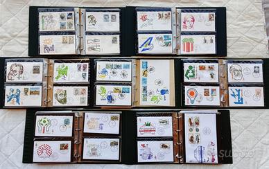 Raccolta di 579 FDC (568 buste standard e 11 "bustoni"), in ottimo stato di conservazione, delle emissioni (commemorativi, ordinaria, aerea ed espressi) dal 08-06-1961 (Ippolito Nievo) al 25-10-1985 (Italia 85 VI). La raccolta comprende anche la FDC per il blocco foglietto emesso il 25-10-1985 (Esposizione Mondiale Filatelica).