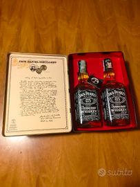 vendo come in foto cofanetto contenente due bottiglie di whiskey Jack Daniel 70ml 43° importato da Soffiantino. Le bottiglie sono identiche, sono ben conservate e sigillate. ad una delle due come si vede in foto è mancante un pezzo del sigillo monopoli pur essendo perfettamente sigillata, probabile che si sia staccato nel toglierla dal cofanetto.