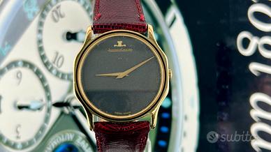 La perfezione funzionale di questo orologio da sera Jaeger-LeCoultre unico nel suo genere non sorprende; raggiunge un livello sbalorditivo di eleganza e precisione, tutto in un unico segnatempo. La cassa intatta in oro giallo 18k con anse sottili