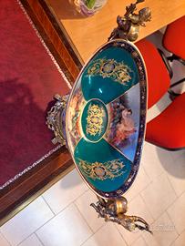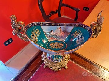 Spettacolare centrotavola in porcellana francese, marchio Sevres sul fondo, porcellana di recente manifattura.. Serie di lavori in bronzo che la rendono un capolavoro, da notate la perfezione delle dame e tutte le cesellature fatte a mano.. colorazione verde smeraldo, con richiami in oro e fascia a tutto tondo dipinta sulla parte centrale lungo tutta la porcellana. altezza 35cm larghezza 41cm