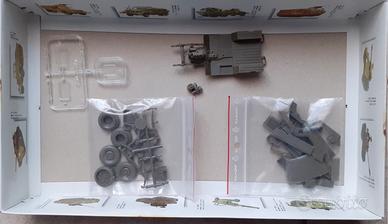 Modello di un veicolo militare in scala 1:35. Iniziato: vari pezzi già tagliati dalle sprues, assemblato motore e tellaio.