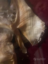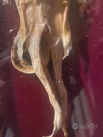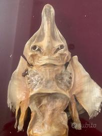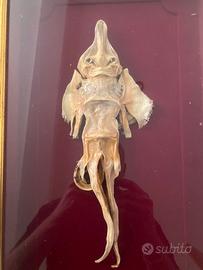 In vendita un affascinante esemplare di Jenny Haniver, un classico pezzo da esposizione delle antiche "Camere delle Meraviglie" (Wunderkammer). Questo oggetto è una vera e propria scultura tassidermica ottenuta dalla sapiente lavorazione di una razza essiccata. Fin dal XVI secolo, i pescatori erano soliti intagliare e far essiccare questi pesci cartilaginei per creare figure antropomorfe o mostruose da vendere ai turisti e ai collezionisti come "draghi neonati" o "creature abissali". Dettagli dell'oggetto: • Soggetto: Jenny Haniver (Razza tassidermizzata). • Presentazione: L'esemplare è montato su un elegante fondo in velluto rosso scuro, protetto da una cornice in legno dorato con vetro. • Stato di conservazione: Ottime condizioni vintage. La struttura cartilaginea è ben preservata, con una splendida patina ambrata dovuta al tempo. La teca presenta lievi segni di usura che ne sottolineano l'autenticità. • Dimensioni:39x29cm cornice Circa 30cm esemplare Consegna a mano o non mi assumo rischio se arriva rotta nonostante imballaggio professionale