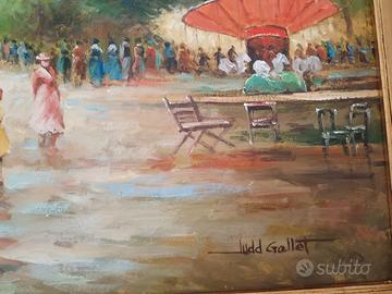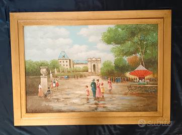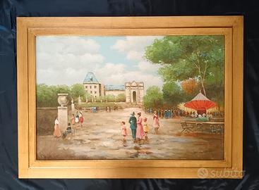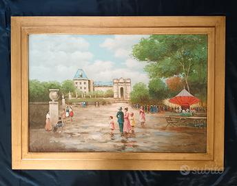 Quadro ad olio su tela firmato Judd Gallet, raffigurante una suggestiva scena parigina in stile impressionista, ricca di dettagli, colori armoniosi e atmosfera elegante. Il dipinto rappresenta una vivace scena urbana con figure, passeggiatori e architetture monumentali, immersi in un contesto naturale con alberi e un caratteristico padiglione rosso. Dimensioni senza cornice: 90 x 60 cm Con cornice: 108 x 78 cm. Elegante cornice in legno dorato inclusa, perfetta per valorizzare l’opera. Quadro pronto da appendere