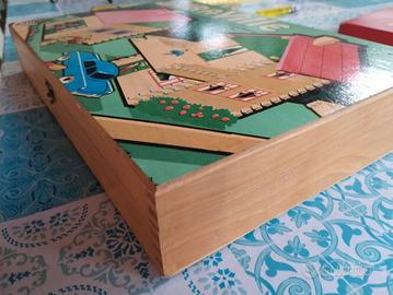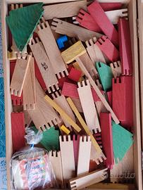 Vecchio Gioco Costruzione in legno JuraVille (costruzione di case), completo di istruzioni, le condizioni usato così come trovato visibile in foto.