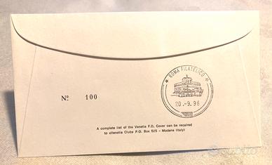 Juventus Campione d'Europa 1995/96 - Busta FDC Numerata 1996 - Venetia Club (Modena) Come nuova Soggetto Juventus Vincitrice Champions League 1995/1996 Tipo di oggettoBusta Primo Giorno (F.D.C. - First Day Cover) Editore/Circolo Venetia Club (Modena) Serie Venetia 891/lt Data di Emissione 14 Settembre 1996 Francobollo Italia, valore facciale 750 Lire (Tifosi in festa e logo Juventus) Annulli Fronte Speciali circolari: "Torino Centro Corr.ze - 14.9.1996" Annullo Retro Filatelico di transito: "Roma Filatelico - 20.9.1996" (Castel Sant'Angelo) Numerazione Esemplare Nº 100 (Edizione a tiratura limitata) Dimensioni Formato standard busta da lettera (circa 16,5 × 9,5 cm)