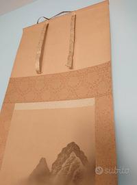 Kakemono Giapponese ,Che cos'è il kakemono? Il kakemono, genere molto diffuso in Asia orientale, consiste in un prezioso rotolo di tessuto o di carta, dipinto oppure calligrafato, che è appeso alle pareti durante occasioni speciali o è utilizzato come decorazione in base alle stagioni dell'anno. in buono stato , dipinto autografato del paesaggio Giapponese montano,compreso di custodia autografata dall'autore . astenersi perditempo e falsi profili misure 188x53 cm " + ss 10?