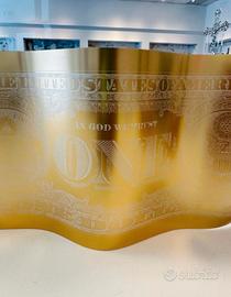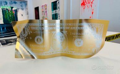 Karl Lagasse – One Dollar GOLD White (2023) Edizione rarissima, limitata a soli 100 esemplari nel mondo (es. n° 30/100). Questa scultura in alluminio verniciato, con linee emblematiche della serie One Dollar, si presenta qui in una versione GOLD White, ormai introvabile presso l’artista. Realizzata a maggio 2023 nell'atelier di Karl Lagasse ad Austin (USA), quest'opera illustra perfettamente l'universo singolare e iconico dell'artista, tra Pop Art e scultura contemporanea. Medium: alluminio verniciato Dimensioni: circa 39 × 17,5 cm Anno: 2023 Edizione: 100 esemplari (qui n°30/100) Autenticazione: firmata nella tavola e accompagnata dal certificato di autenticità dell'atelier dell'artista. Un pezzo esclusivo e molto ricercato, destinato ad arricchire qualsiasi collezione esigente di arte contemporanea.