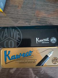 Articolo nuovo. La penna ha un design nostalgico con un corpo in resina acrilica di alta qualità nei colori verde e beige.Presenta dettagli placcati in oro, inclusa una clip elaborata con il logo Kaweco.È un modello di penna stilografica che utilizza cartucce standard o un convertitore standard per l'inchiostro.La penna è lunga 13 cm chiusa e 16 cm con il cappuccio calzato e viene fornita in una scatola di latta speciale, come quella mostrata nell'immagine.