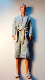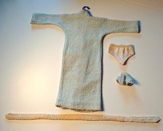 Completo Ken Barbie: Terry Togs #784 vintage 1961 Incluso: accappatoio, cintura per accappatoio, pantofole, biancheria intima (scolorita con alcune macchie) Mancanti: sapone, spugna, asciugamano, pettine, rasoio elettrico. La bambola Ken è venduta separatamente con il costume da bagno originale €80.