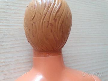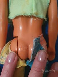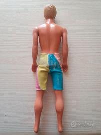 Ken Wet & wild Barbie - Ken acqua magic vintage 1989 Mattel, con i vestiti originali e il "magico costume che cambia colore ad ogni tutffo". La bambola in sé è in ottime condizioni, le braccia si muovono, il colorito originale è buono, c'è qualche traccia di usura sui capelli, come si vede in foto. I vestiti originali, invece, ci sono ma sono un po' lisi, i pantaloni sono un po' consumati e la maglia un po' sgranata sul davanti e con qualche macchia sul retro.