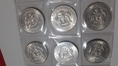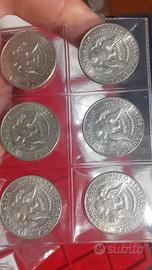 6 monete da mezzo dollaro Kennedy dal 1964 al 1969-6 pezzi argento titolo 900 il 1964 e titolo 400 dal 65 al 69 per un totale di argento fino di grammi 34,55