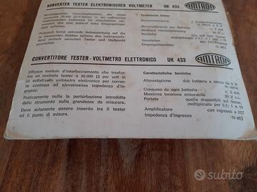 Convertitore in kit da assemblare, trasforma un tester da 20.000 Ohm in voltmetro elettronico per corrente continua. Nuovo in confezione mai aperta, anni '70.