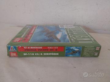 kit di montaggio BF-110 C3/4 Zerstörer in scala 1:72, prodotto da Italeri, parte della serie "Modellismo Facile". Il modello rappresenta il celebre caccia pesante bimotore della Luftwaffe utilizzato durante la Seconda Guerra Mondiale.