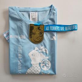 – Maglia tecnica Adidas taglia M (UK M / US M), colore azzurro, tessuto traspirante, grafica evento “Coelmo Napoli City Half Marathon 2026” e claim “All Runners Are Beautiful”, made in Spain.
