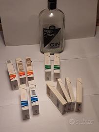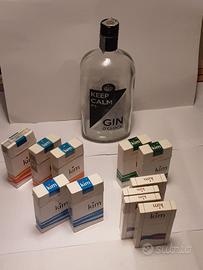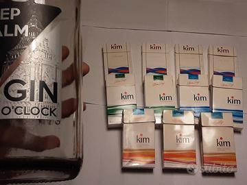 11 pacchetti di sigarette KIM vuoti ,diversi come tipologia , 3 rosse , 2 verdi, 2 blu, 2 slim pacchetto largo, 2 super slim pacchetto piu' sottile, sia come provenienza , vedi bollo tedesco, ben messi come da foto, ed una bellissima bottiglia di Gin con etichetta in rilievo, forse poco visibile in foto,..in particolare per le signore eleganti che non si fermano davanti ad un gin qualunque....kit a euro 20, pagate solo i pacchetti la bottiglia la metto perche' secondo me e' molto bella,per fare un angolo vintage ..... Marco 348 5156407 ..grazie