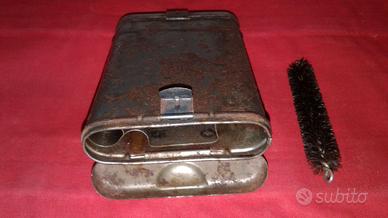 Vendo n. 1 scatola seconda guerra mondiale custodia per spazzole per carabina k98 tedesco, in buone condizioni come da foto, articolo ARR 43, misure lunghezza 13,5 cm, larghezza 9 cm, spessore 2 cm. Completo di una spazzola come da prima foto. 1 scatola custodia sanitaria dell'esercito italiano della seconda guerra mondiale completa di siringa in vetro e bollitore in alluminio. Spese di spedizione 10 euro.