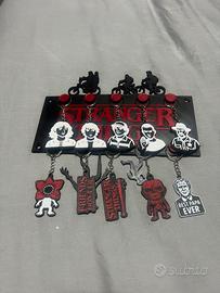 Supporto da Parete "The Upside Down" (Sottosopra): Una base nera con il logo STRANGER THINGS in rilievo rosso. Design iconico che rappresenta i ragazzi in bicicletta (sopra) e la silhouette del Demogorgone (sotto, per il "Sottosopra"). Con 5 ganci rossi per appendere i portachiavi (e non solo!). Pronto per essere fissato alla parete (fori pre-tagliati).