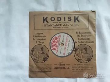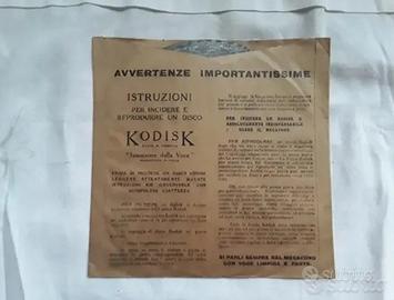 Disco e busta in materiale cartaceo, di formato cm. 16x16 circa; sul retro due illustrazioni che mostrano un uomo intento a parlare o cantare tramite un megafono all'interno della tromba di un grammofono: in pratica, il sistema brevettato Kodisk permetteva l'auto-registrazione di un disco, pratica possibile rispettando le istruzioni specificate sulla busta-contenitore,