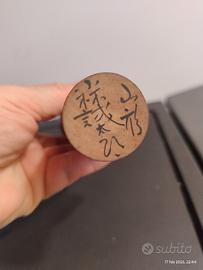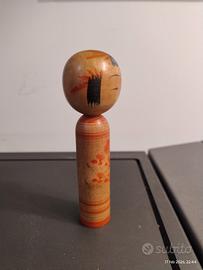 Kokeshi tradizionale vintage giapponese in legno dipinta a mano, sotto presente la firma dell'artista.