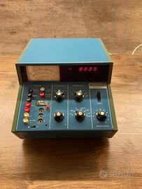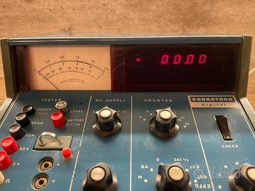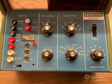 Raro set professionale Kronatron Digital per il test e la riparazione di orologi (meccanici, quarzo e LCD). Lo strumento è un pezzo iconico dell'attrezzatura da laboratorio orologiaio vintage, risalente agli,anni ‘70/‘80,completo di microfono a morsetto originale per la captazione del segnale e cavo di collegamento. Il pannello frontale presenta tester analogico, display digitale a LED rossi, alimentatore DC integrato e selettore di frequenza specifico per quarzi e 32kHz. L'estetica è ben conservata come da foto, ideale per professionisti del settore, collezionisti di strumentazione tecnica o appassionati di riparazioni vintage. Testato e funzionante da un amatore, non da un orologiaio professionista