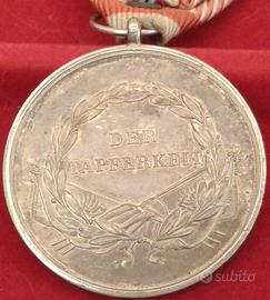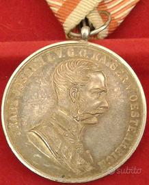 Bella e rara grande medaglia d'argento WW1 "TAPFERKEIT" (Coraggio) 1914-1917, di prima classe, rilasciata dal Kaiser Franz Joseph, un premio al coraggio per la partecipazione alla Grande Guerra. WW1 1914 1918. Opus Friedrich "Franz" Leisek. Il Kaiser Giuseppe II istituì per la prima volta una medaglia commemorativa d'oro e d'argento il 19 luglio 1789 per sottufficiali e soldati semplici che si erano distinti davanti al nemico.Dal 1809 questa era nota come Medaglia al coraggio o Tapferkeitsmedaille.Il 19.8.1848 il Kaiser Ferdinand divise la medaglia d'argento al coraggio in due classi: una di prima e una di seconda.La medaglia di 2a classe è una versione più piccola con Ø31mm.Il 14.2.1915 il Kaiser Franz Joseph introdusse la medaglia di bronzo che aveva le stesse dimensioni dell'argento di 2a classe.A differenza delle altre medaglie, la medaglia di bronzo potrebbe essere assegnata a sottufficiali e soldati semplici degli eserciti alleati.Le medaglie al coraggio mostravano la testa del Kaiser regnante sul dritto.Nel caso di Francesco Giuseppe, era raffigurato con l'uniforme da maresciallo e sul bordo esterno della medaglia era posta la seguente iscrizione: "FRANZ JOSEPH IVGG KAISER V. OESTERREICH" (Franz Joseph I, per grazia di Dio Imperatore di Austria).Il dritto mostrava sei bandiere reggimentali incrociate circondate da una corona d'alloro e il motto: "Der Tapferkeit".Il diametro della medaglia d'oro e d'argento grande era di 40mm.Il nastro della medaglia al coraggio era lo stesso nastro bianco e rosso della croce al merito militare con spade incrociate in bronzo dorato per combattenti.Un Decreto Imperiale del 29.11.1915 introdusse le barre per premi ripetuti e queste presero la forma di una barra di ferro antiruggine liscia larga 8mm. I destinatari delle medaglie d'oro e d'argento ricevevano anche una pensione. Pagamenti: Bonifico Bancario, Paypal verso amici, altri sistemi postali.