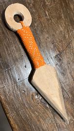 Kunai di legno con manico in corda colorata, robusto e adatto sia a esposizione che ad uso da allenamento e pratica.