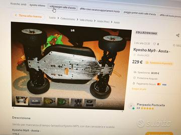Vendo, per mancanza di tempo, fantastica Kyosho MP9, completa di due carrozzerie e scatola di avviamento Sirio. La scatola di avviamento è funzionante, ma priva dei cavi. TX/RX e batterie non inclusi.