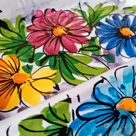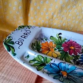 "La Cava" ceramica artistica Lastra a Signa, Firenze. Fondata nei primi anni '50 da Alberto Caverni e attiva fino ai primi anni '70. Piatto porta burro/ antipasti decorato a mano anni '60. cm 25 x 13