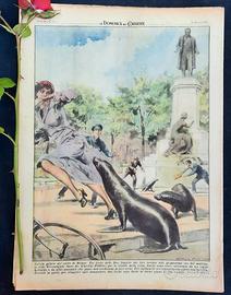 Caccia polare nel cuore di Milano. Tre foche dello zoo, fuggite dal loro recinto alle primissime ore del mattino, si sono avventurate fuori dei Giardini pubblici per le strade della città, finché sono state avvistate da un vigile notturno e da altri passanti che quasi non credevano ai loro occhi. Per catturarle si è organizzata subito una battuta; durante la quale, per sfuggire agli inseguitori, due foche sono finite al terzo piano di uno stabile. (Disegno di Walter Molino)