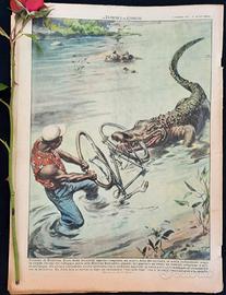 Ciclismo in Rodhesia. Fiero della bicicletta appena comprata, un negro, John Matukutuku, la stava collaudando lungo la strada che dal suo villaggio porta alla Missione Katondive, quando, nel guadare un fiume, un violento strattone lo getto nell'acqua. Un grosso coccodrillo aveva afferrato con le poderose mascelle la ruota posteriore tentando di strappargli via la bicicletta. Ma John non si arrese e, dopo un estenuante tiro alla fune con il mostro, riuscì ad avere la meglio. (Disegno di Walter Molino)