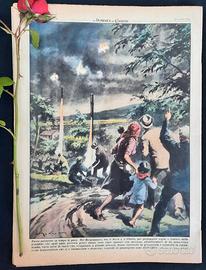 Fuoco antiaereo in tempo di pace. Nel Bergamasco, tra il Serio e il Cherio, per proteggere vigne e frutteti dalla grandine che ogni anno provoca gravi danni, sono state sparate con successo, all'avvicinarsi di un minaccioso nembo, varie serie di razzi che, scoppiando a grande altezza, hanno interrotto la grandinata e sconvolto la formazione temporalesca che si è sminuzzata e dispersa; cosicché le piantagioni sono state salve. (Disegno di Walter Molino)