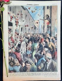 L'addio di Roma alla piccola Annarella. Sotto una pioggia di fiori, una moltitudine immensa ha seguito i funerali della bimba barbaramente uccisa nel sobborgo di Primavalle. La salma, vestita con l'abito della prima comunione, era deposta su una candida berlina tirata da quattro cavalli bianchi, come nelle fiabe. (Disegno di Walter Molino)