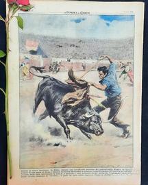 Grazia al torero fuorilegge. In Bilbao, durante una corrida alla presenza del generalissimo Franco, un ignoto armato di una spada di legno, è balzato nell'arena mettendosi a giostrare temerariamente col toro, tra gli applausi frenetici della folla. Intervenuta la polizia, il pazzoide è stato arrestato ma gli spettatori, sventolando i fazzoletti, hanno chiesto clemenza al "Caudillo", il quale ha fatto subito rimettere l'uomo in libertà. (Disegno di Walter Molino)
