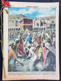 Pellegrinaggio a nuoto nel deserto. Fenomeno raro: le piogge hanno trasformato in lago la spianata della Grande Moschea della Mecca, nel cuore dell'Arabia, dove sorge la Caaba, pietra sacra dei maomettani. Per raggiungere il venerato monumento i pellegrini hanno dovuto immergersi nell'acqua e perfino procedere nuotando. (Disegno di Ugo Matania)