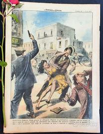 Gangsters d'amore. Nella piazza di Afragola (Napoli) un pretendente respinto, con la scorta di un gruppo di amici armati, ha affrontato una ragazza che passava insieme con la madre; e, intimoriti i passanti con colpi di rivoltella in aria, è riuscito a rapirla. (Disegno di Walter Molino)