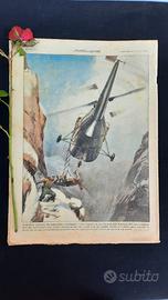 L'elicottero alpinista. Un audacissimo salvataggio è stato compiuto in una alta gola delle Montagne Rocciose in Canada dove due escursionisti sono rimasti bloccati perché uno si era rotta una gamba. L'aereo si è calato quasi a piombo in mezzo alle due pareti e con delicata manovra è riuscito a prendere a bordo il ferito per mezzo di una barella. (Disegno di R. Ferrari)