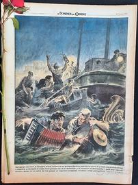 Salvagente musicali. A Chioggia, urtata nel buio da un motopeschereccio, una barca carica di gitanti con un’orchestrina è sbandata scodellando in acqua varie persone tra cui il ‘batterista’ , e il suonatore di fisarmonica; i quali, non sapendo nuotare, hanno avuto salva la vita grazie ai rispettivi strumenti, rivelatisi ottimi galleggianti.(Disegno di G. de Gaspari)