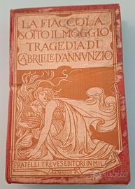 "La fiaccola sotto il moggio". Tragedia"diGabriele D'Annunzio, pubblicata dagli editoriFratelli Trevesdi Milano, 1922. L'illustrazione di copertina e le xilografie interne sono opera diAdolfo De Carolis, un noto artista che ha collaborato a lungo con D'Annunzio.